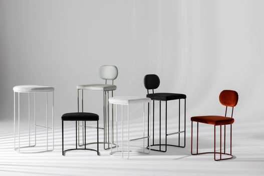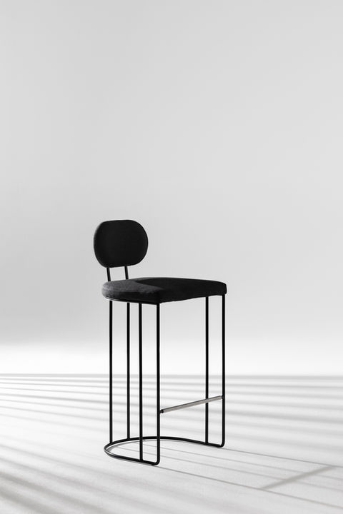 Sedis chairs and barstools. The Sedis seating range balances sculptural curves with strong, minimalist lines informed by Art Deco period architecture. Sedis has been designed to subtly elevate any space. The full range offers six size variations, from low stool to chair, to low and high barstools with or without backs. Sedis’s simple design offers modest proportions and comfort, blending versatility with a sophisticated, timeless aesthetic. The seat and backrest for Sedis may be upholstered in fabric or leather.